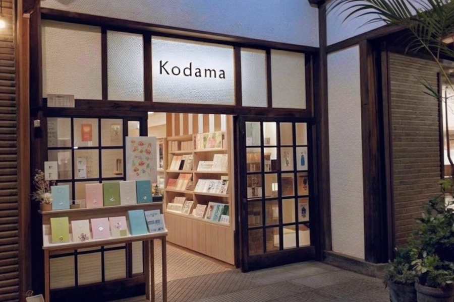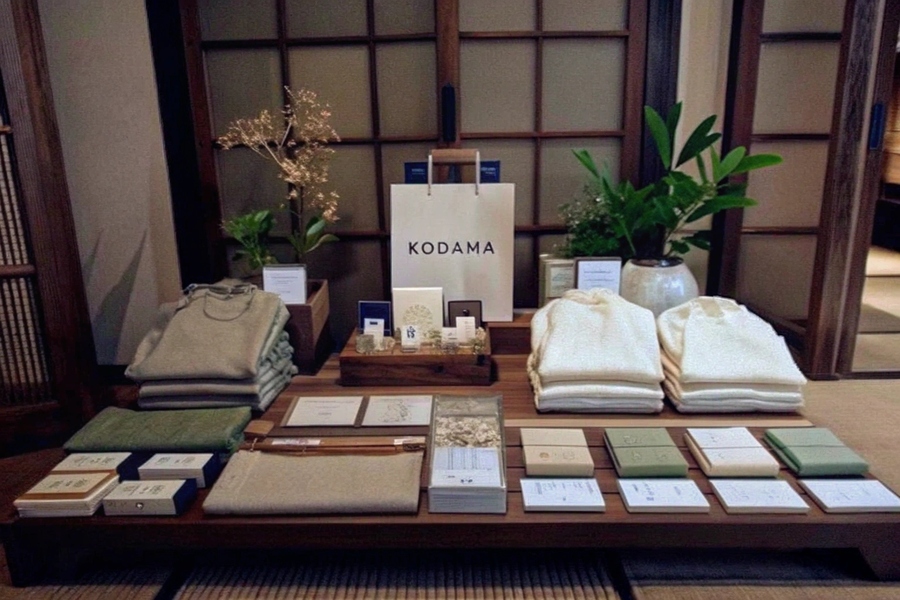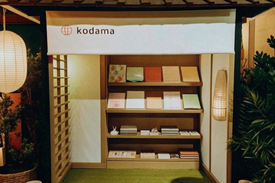 Recraft, prompt: design the shop house for brand 'KODAMA' of eco-friendly stationery from Japan, with stationery products made in soft neutral tones such as white, beige, light green, eco-friendly appearance.