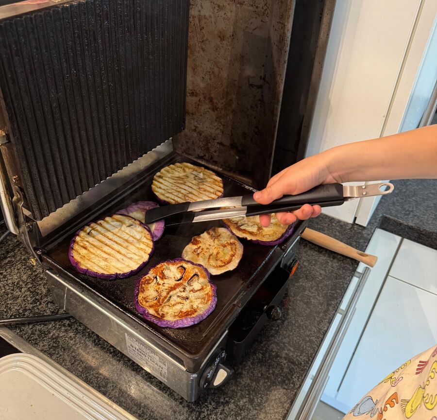 2. Приготовление компонентов: Обжарить слайсы баклажана на гриле или сковородке с оливковым маслом до лёгкой золотистости.