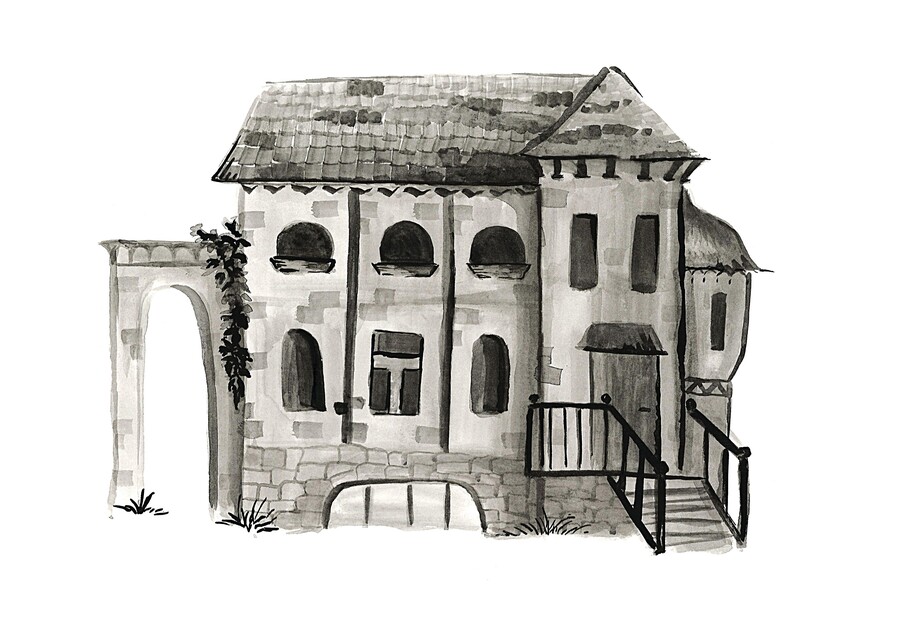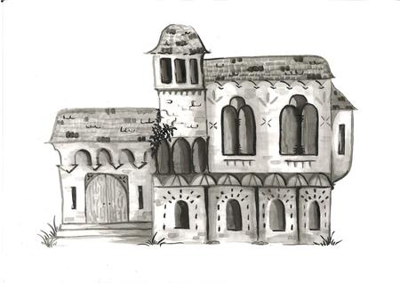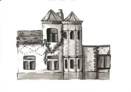 1. Сильно разбавленными чернилами намечался контур. 2. Такими же бледными чернилами, смешанными с водой, заливалось все здание 3. Добавлялись мелкие детали, затемняющиеся за счет наложения нескольких слоев. 4. Обводка черными чернилами отдельных участков.