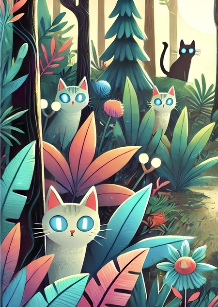 greeting card featuring a charming wild forest. The scene is filled with lush, colorful plants and towering trees, among which you can see cats — ears, tails and glowing eyes peeking out from under the foliage, creating a magical and mysterious atmosphere. The card reads Polosa (Промпт для двух последних картинок)