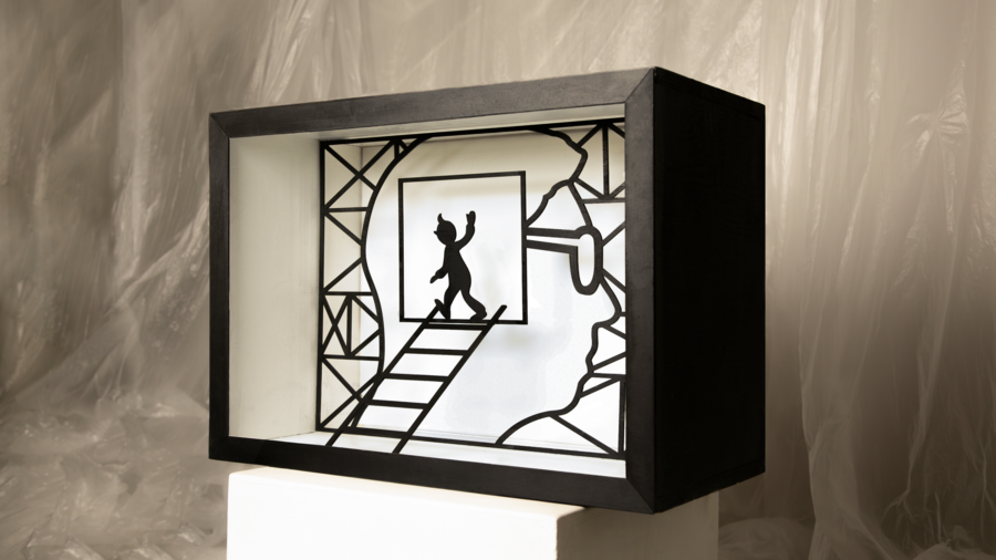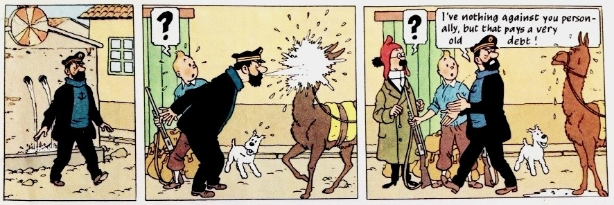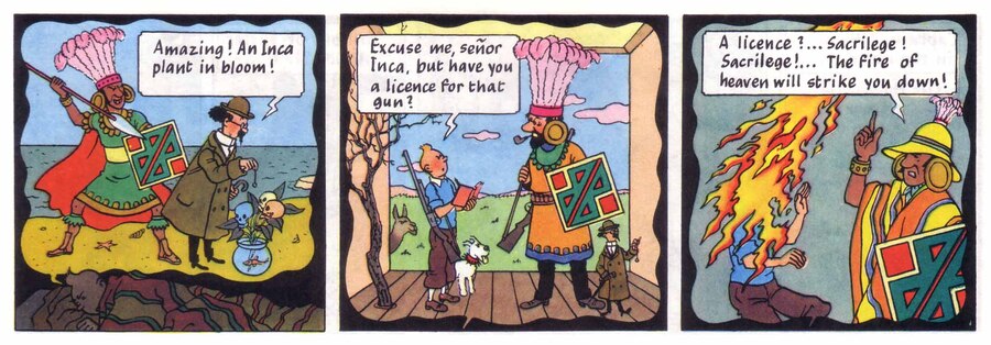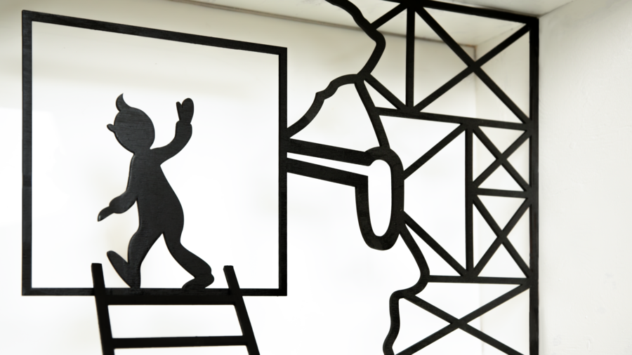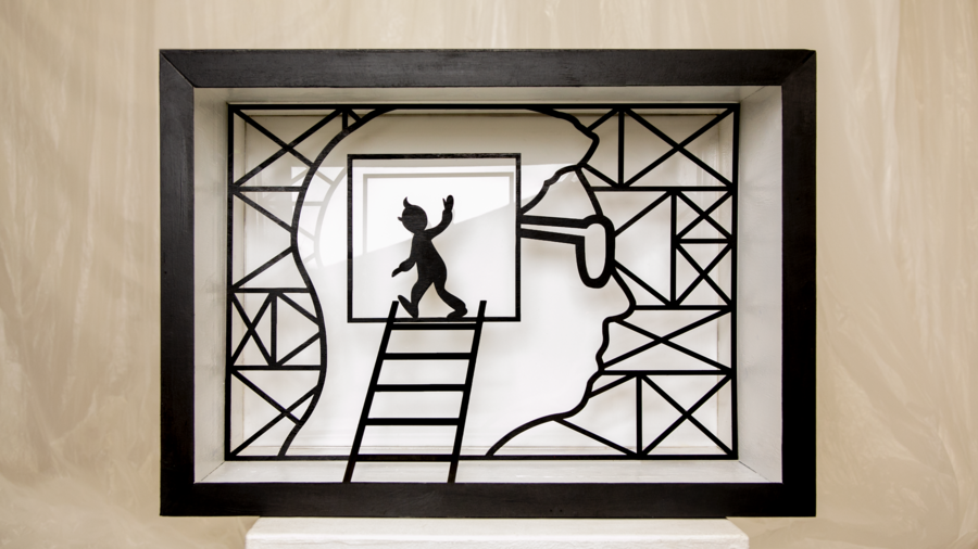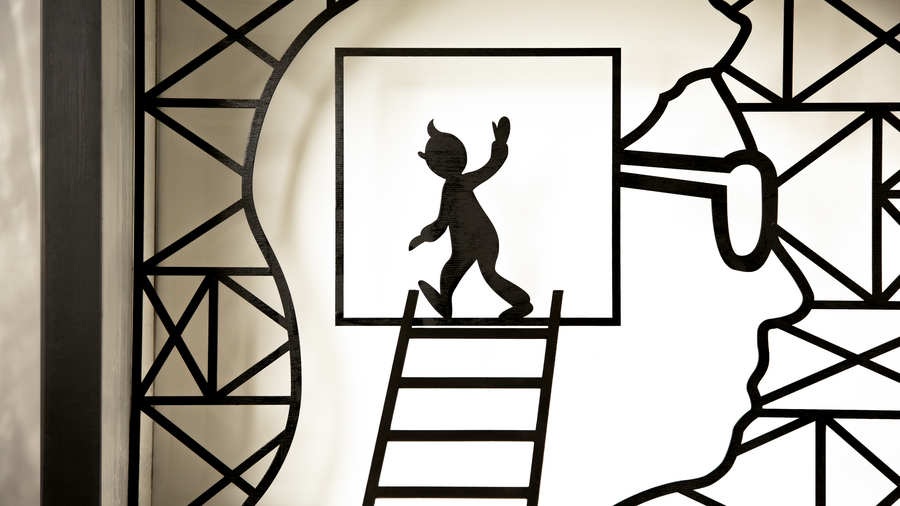 Витрина выставки по вселенной «Приключений Тинтина» не только исследует визуальный стиль работ автора, но и затрагивает вопрос о развитии главного героя, как персонажа.