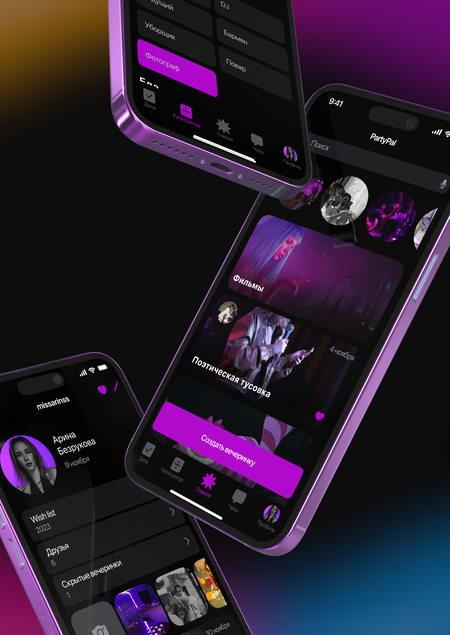 PartyPal— приложение, которое поможет молодым людям качественно организовать праздник с минимальной затратой энергии. В нем будут собраны концепции мероприятий и советы по организации, калькулятор сметы и To Do листы, которые помогут пользователям. За метафору были взяты лучи софитов.