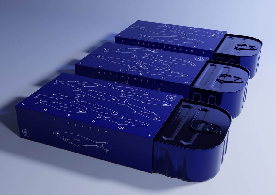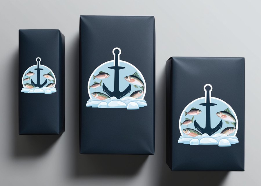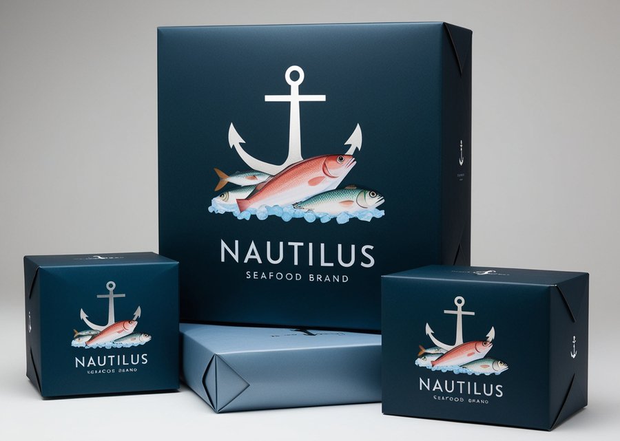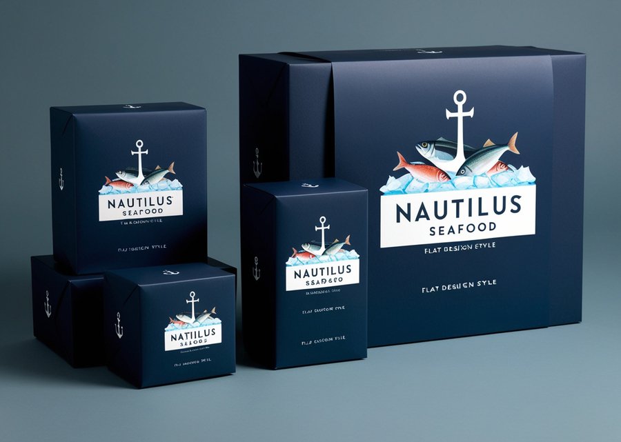 prompt: three dark blue-colored packaging with different sizes branded with NAUTILUS seafood brand with flat design style logo with minimalistic anchor in ice and with fresh fish around it