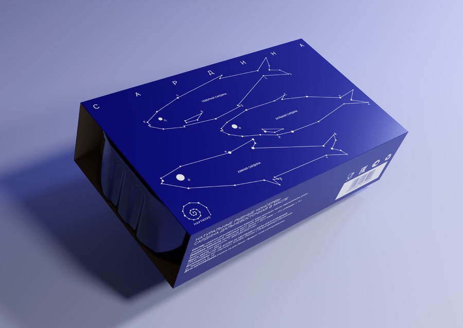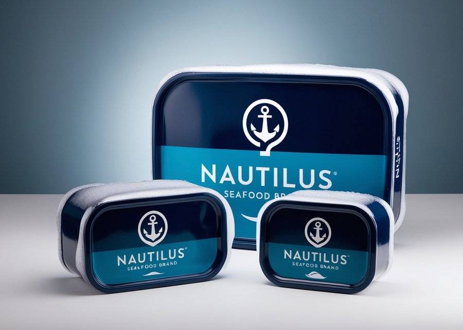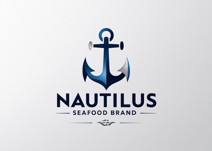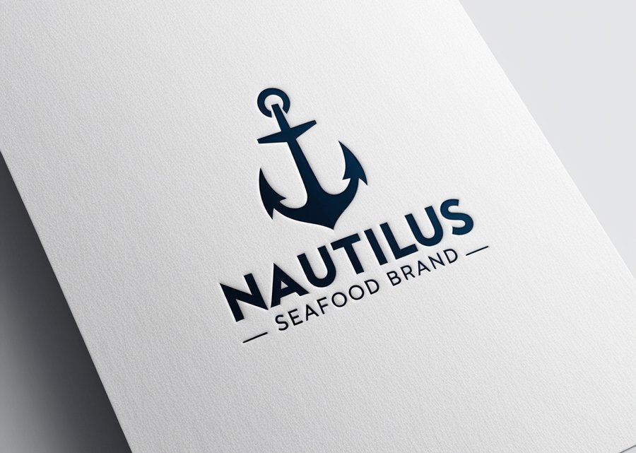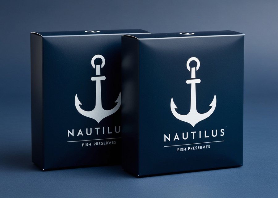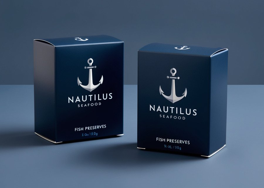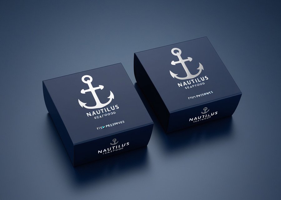 prompt: dark blue-colored packaging branded with NAUTILUS seafood brand with flat design style logo with minimalistic anchor