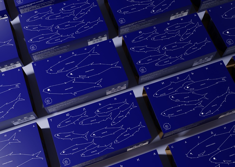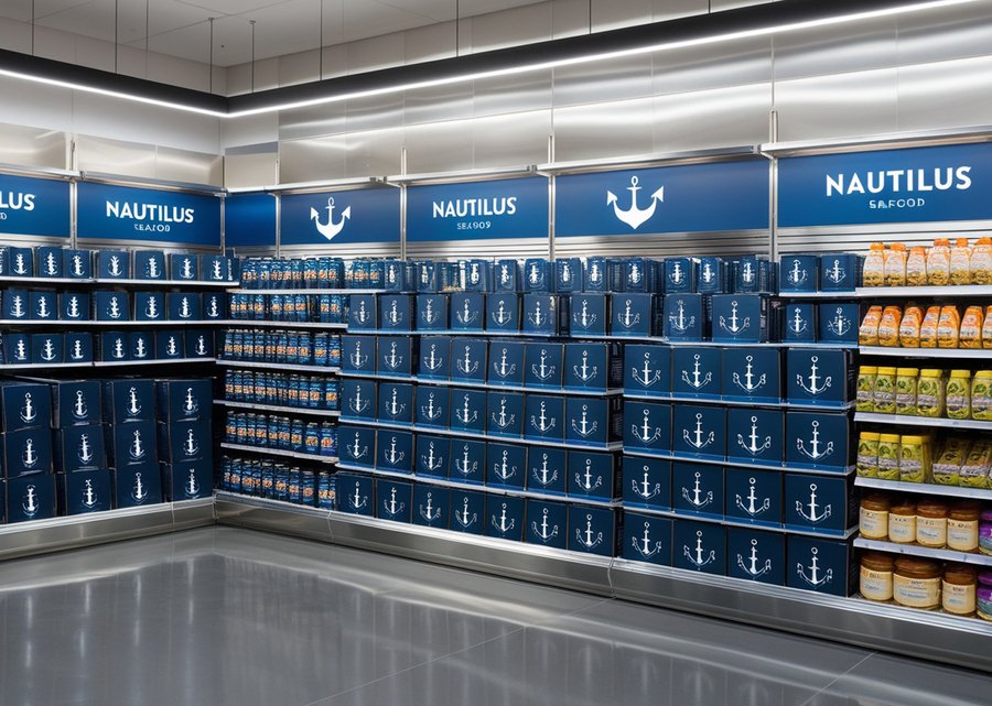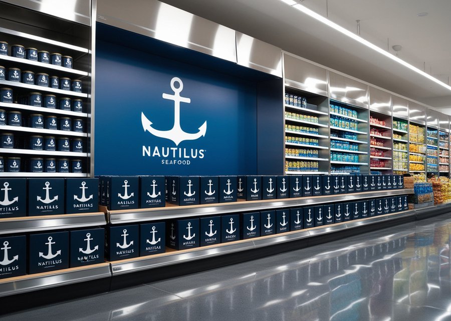 prompt: a grocery store with an emphasis on the shelves where a lot of dark blue-colored packaging of the NAUTILUS seafood brand with flat design style logo with minimalistic anchor are located