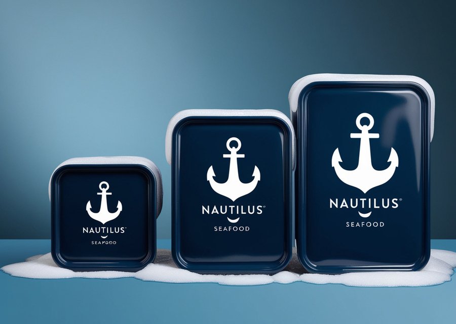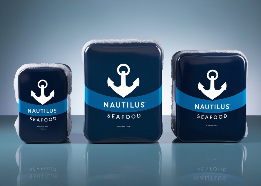 prompt: three dark blue-colored packaging with different sizes covered in ice branded with NAUTILUS seafood brand with flat design style logo with minimalistic anchor