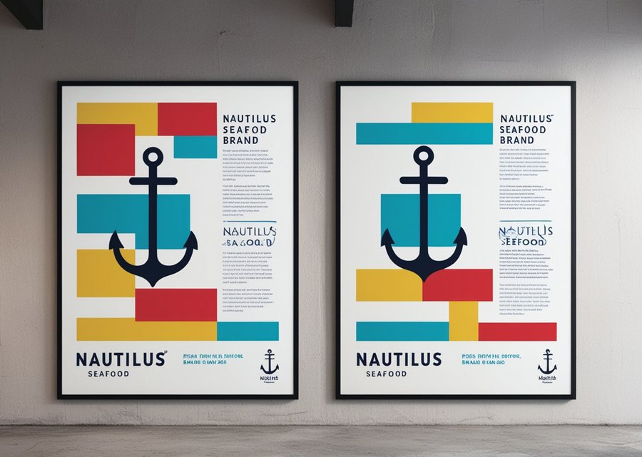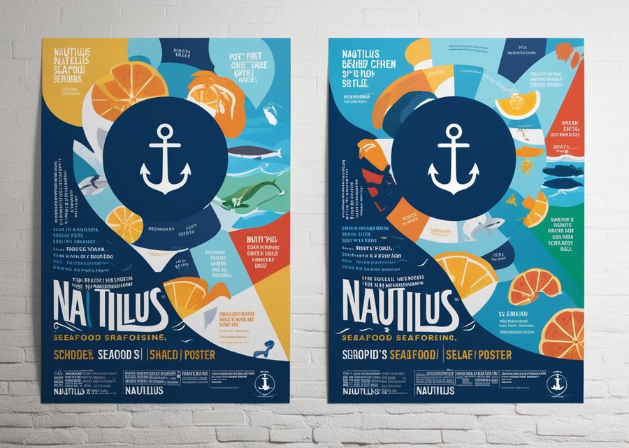 prompt: two advertising posters on the wall with flat design with chaotic composition and lots of details with a lot of text advertising the NAUTILUS seafood brand flat design style logo with minimalistic anchor