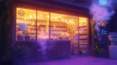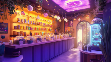Промпт: Realistic interior/exterior photo of a store selling mystical fortune-telling tea. Soft and flowing shapes and shadows. Soft purple, yellow, orange and blue colors. Mystical and fancy atmosphere. Esoteric decor. --ar 16:9