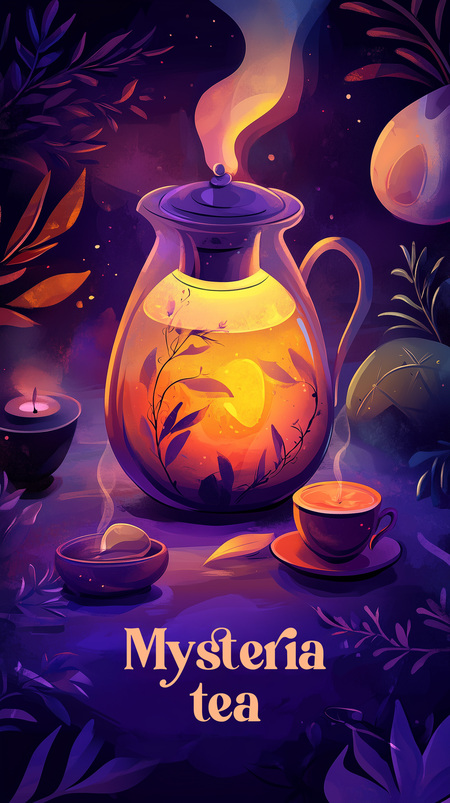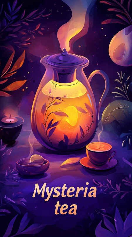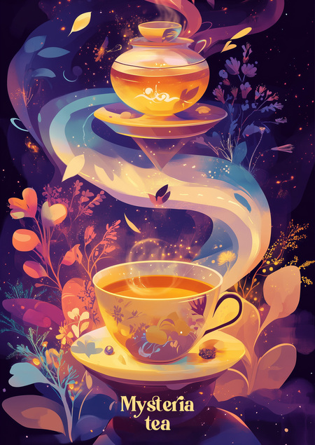 Промпт: Promotional illustrated poster for a brand of mystical fortune telling tea. The poster should have the inscription «Mysteria tea» on it. Soft and flowing shapes and shadows. Lots of gradients and highlights. Soft purple, yellow, orange and blue colors. Fancy and mysterious look. --ar 9:16