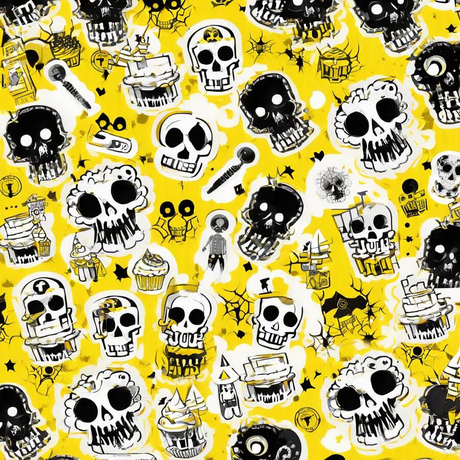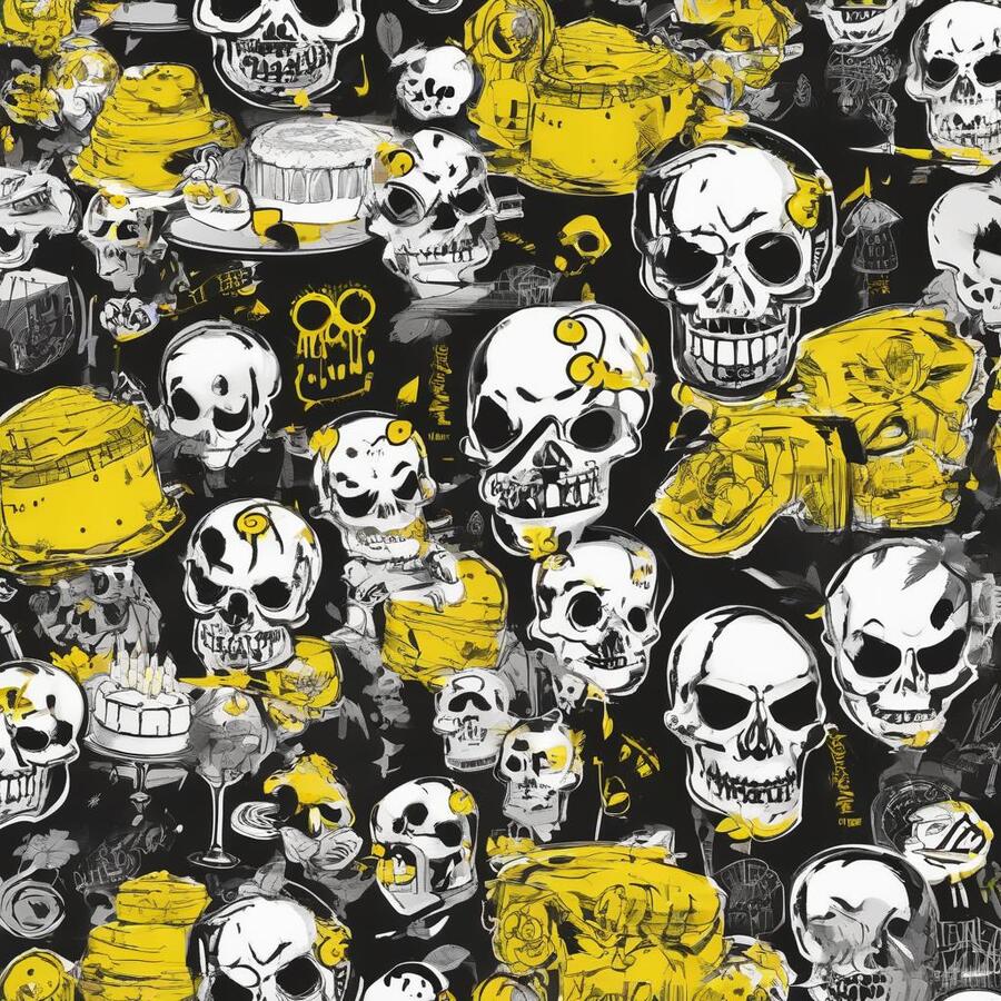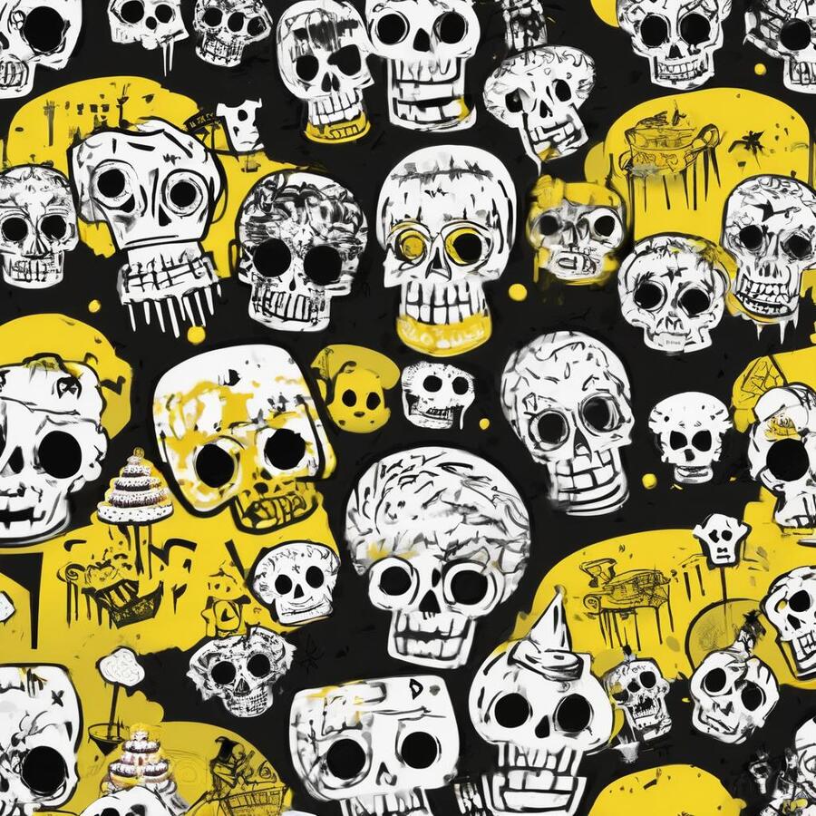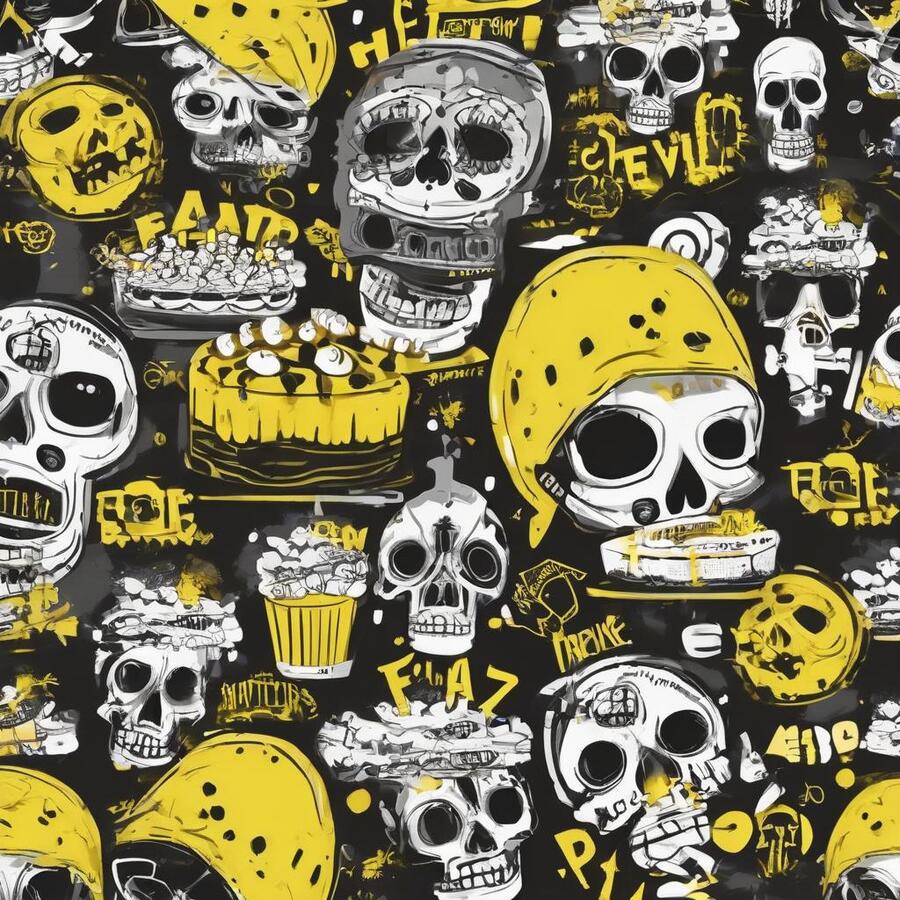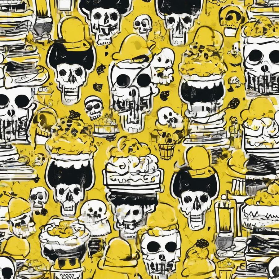Промт: create a pattern for a pastry shop, paint it with traditional materials (streaked paints, pencils, ink, chalk), you can use images that are characteristic of the horror universe, skulls, bones—frightening things, and you can also use images that are characteristic of baking, do not mix. Act like a professional designer, with at least 10 years of experience, the colors you should use are black, white and yellow, using other colors is considered a violation Использованные инструменты:https://ideogram.ai/t/explore