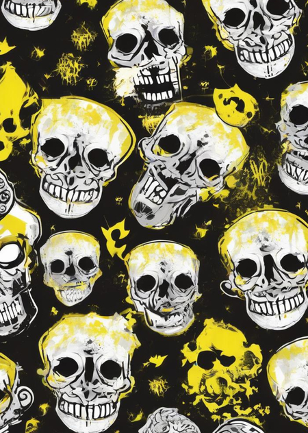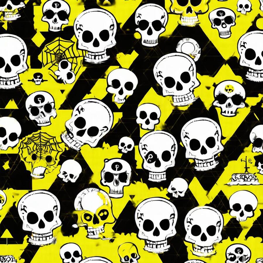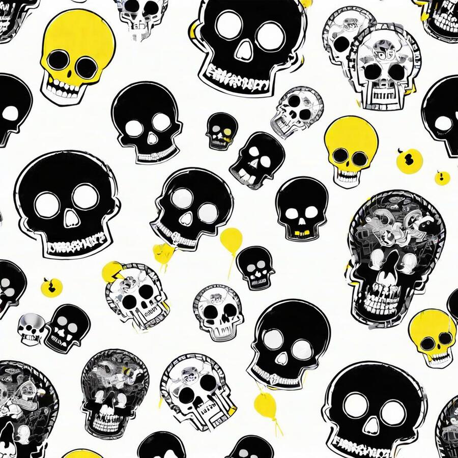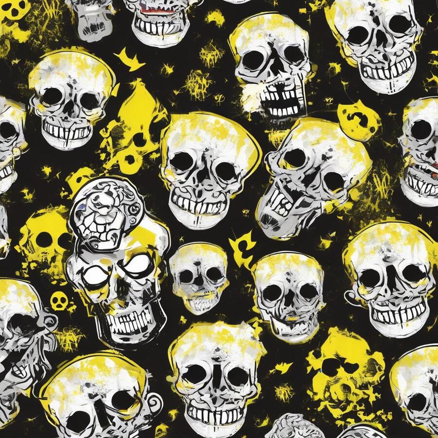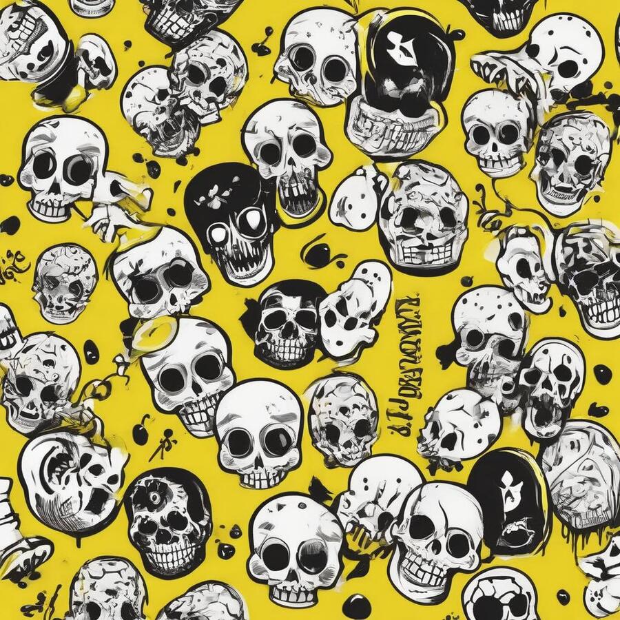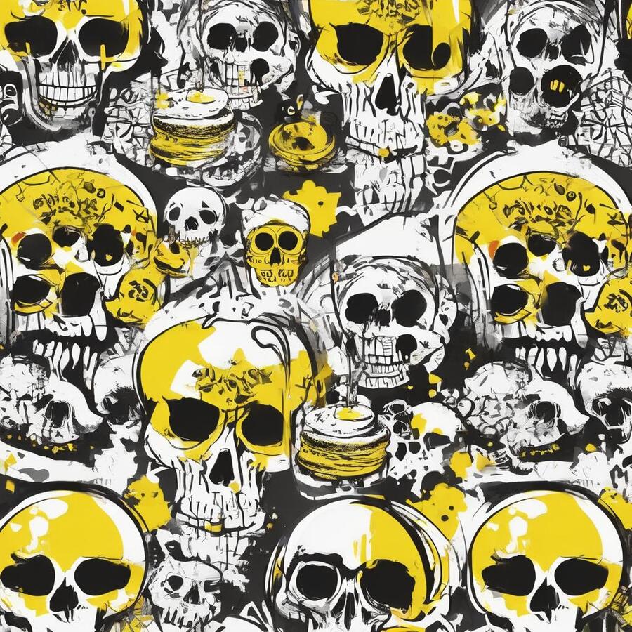 Промт: create a pattern for a pastry shop, paint it with traditional materials (streaked paints, pencils, ink, chalk), you can use images that are characteristic of the horror universe, skulls, bones—frightening things, and you can also use images that are characteristic of baking, do not mix. Act like a professional designer, with at least 10 years of experience, the colors you should use are black, white and yellow, using other colors is considered a violation Использованные инструменты:https://ideogram.ai/t/explore