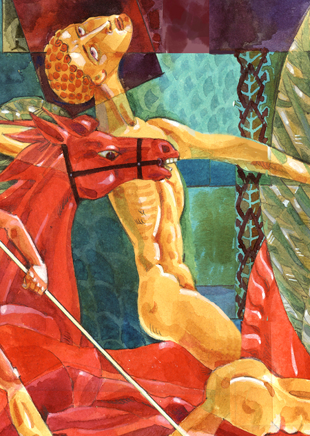 Друзья мои, я расскажу вам притчу о том, как у нас не был зачат один из самых изящных стилей в искусстве 20 века — стиль Ar-Deco. В конце 19 века был утверждён Русско-Византийский стиль- бастард связи русского барокко c европейским классицизмом и слуга идеологии «Державность-Православие-Народность». В моей истории он представлен стилем Ивана Билибина- русского книжного художника. Это томно- тревожное состояние пробуждения Змея. Народ молит о защите перед тревожной сменой эпох. Свет Солнца меркнет. В недрах родной земли просыпается Заступник и вылетает на бой со Змеем. Модерн и символизм уничтожают привычку к стабильности и логику, превращая жизнь в сон, сон порождает анархию. Заступник вышел из картины русского художника- символиста К. С. Петрова- Водкина «Купание красного коня». Небесный Конь путается в кольцах тела Змея, тонкое интеллигентное копьё ломается, щепки Модерна разлетаются. Заступник падает, проигрывая Новому времени. Солнце Прошлого мира уже невозможно спасти, его лицо- абстрактный лик Зверя с картин художника П. Н. Филонова. Из будущего грядёт титанический Хам. Грохот крушения мира. Где тут место снам модерна или утончённостям Ar-Deco? Больше нет пространства для личного самовыражения художника. Грядёт Тоталитарное искусство- робот идеологии Государства.