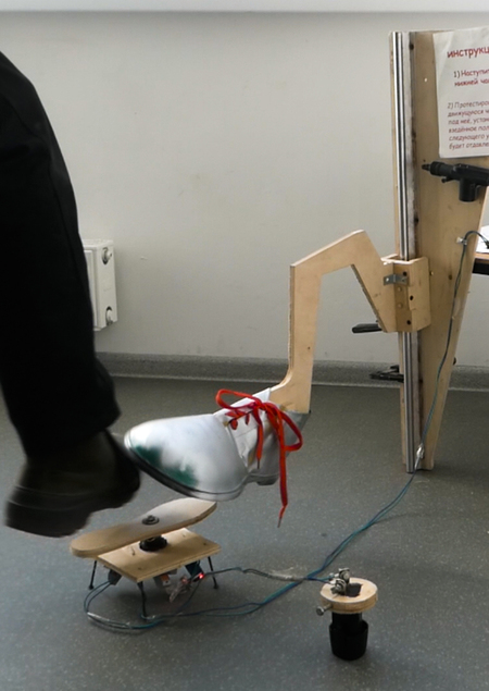 Участнику эксперимента предлагается подставить свою ногу под удар. Устройство активируется нажатием на педаль, что приводит в действие механизм наступания на нажавшую ногу.