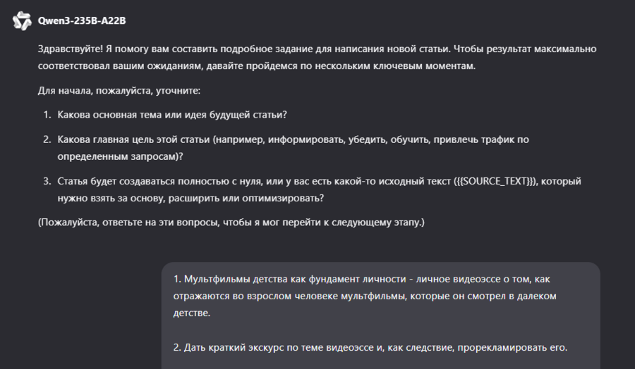 ИИ — удобный инструмент для генерации идей и брейншторма. Очевидно, что работа с Qwen помогла мне сформулировать мысли в единый текст, выделить важные аспекты таргетовой аудитории и платформы, на которой я планировала публиковаться.