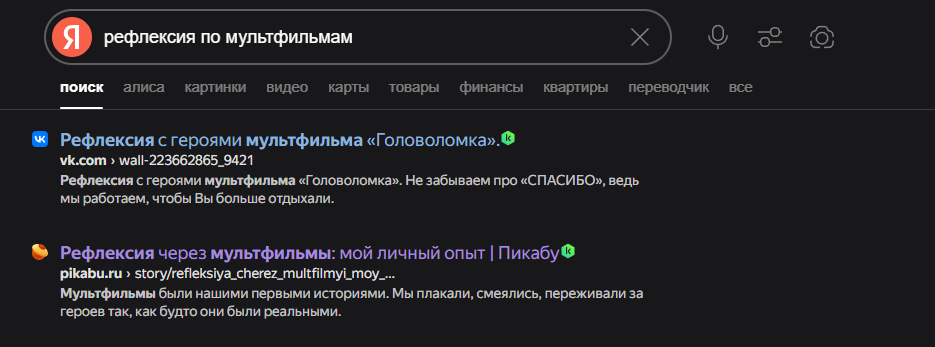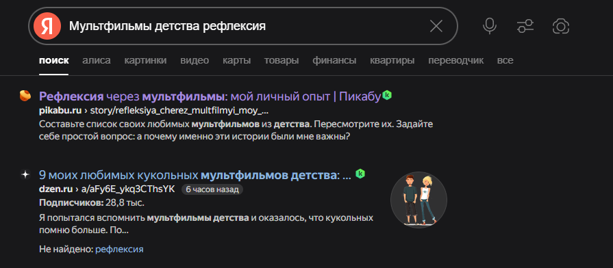 Поисковые запросы могут привести искателя к моей статье на Пикабу. Однако здесь важно иметь ключевые слова «рефлексия» и «мультфильмы детства» в комбинации (например «ностальгия по мультфильмам» выведет совершенно другие статьи).