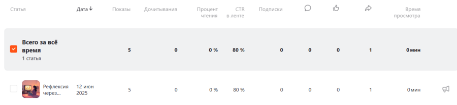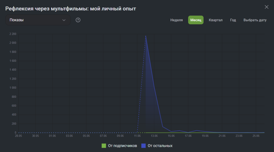 Несмотря на охват в 2560, статья находится в сфере самоанализа и рассуждений, а здесь достаточно большое разнообразие тем. Поиск по обобщенным запросам не приведет к моей статье из-за количества смежных концепций, однако на более локальном уровне схожих публикаций будут единицы.