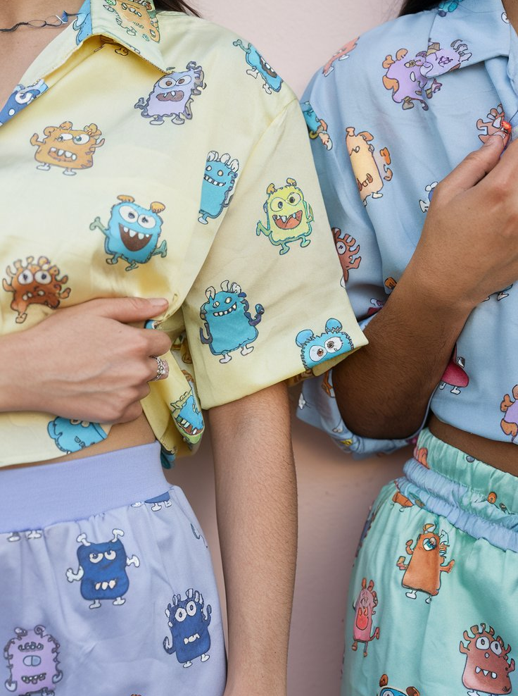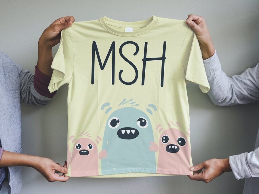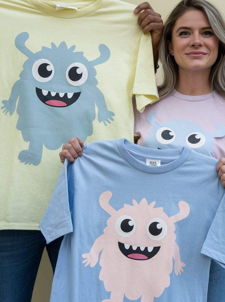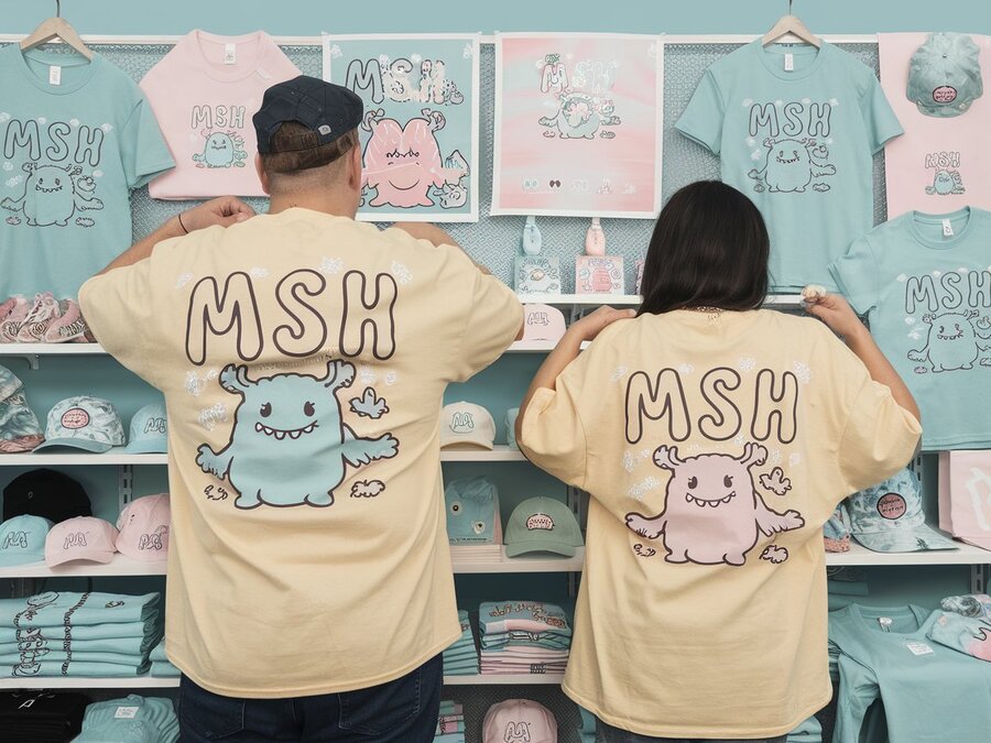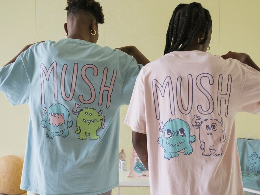 Prompt: A photo of two people in T-shirts with prints of cute monsters and name «Mush» (handwritten font). Light yellow, light blue and pale pink colors are used.