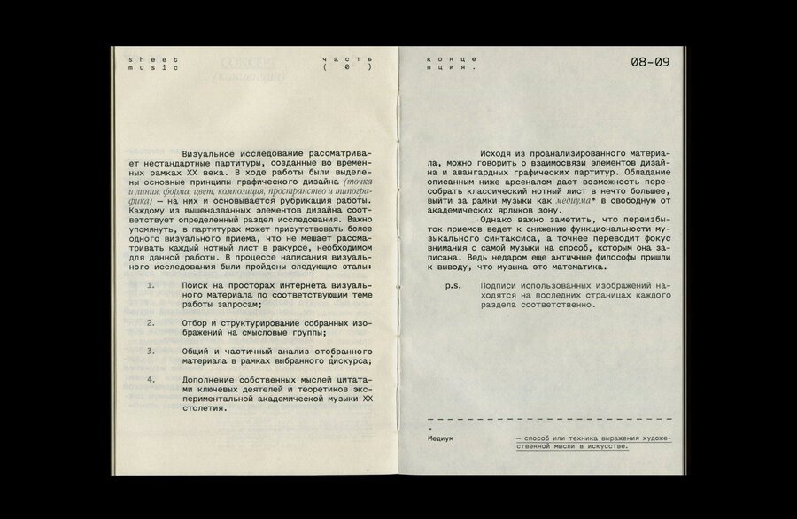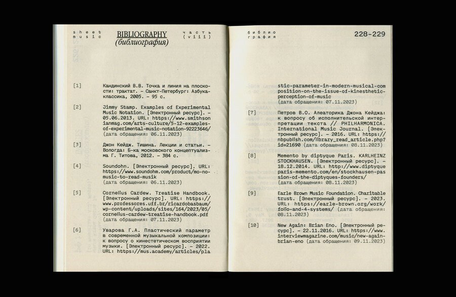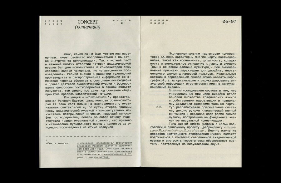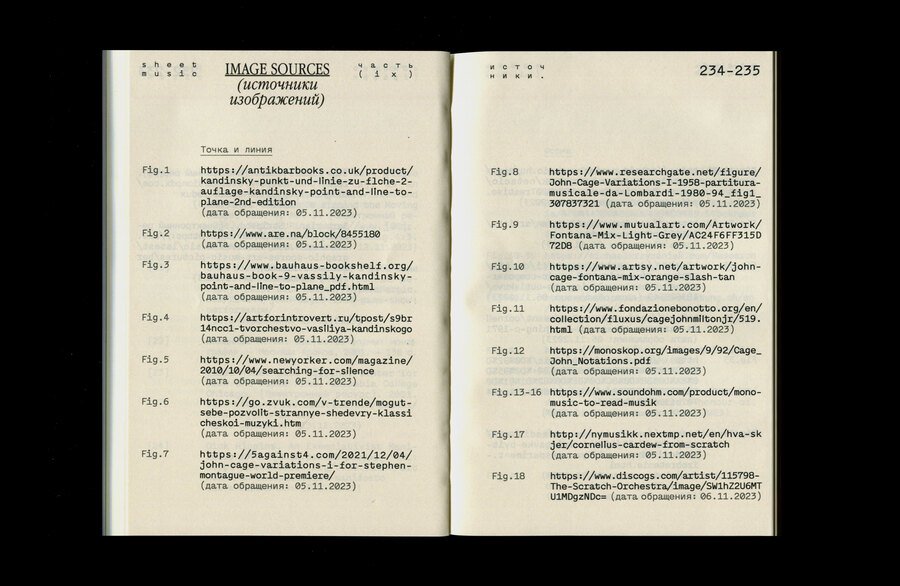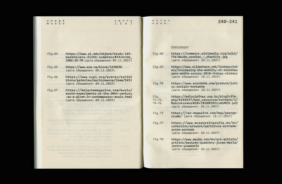 Книга названа «Sheet Music», что в переводе означает нотный лист. Визуальное исследование рассматривает графические партитуры XX века, ставшие автономным медиумом в период, когда стерлась грань между академической музыкой и концептуальным искусством. Композиторы-экспериментаторы деконструировали классический нотный синтаксис и создавали партитуры, основываясь на принципах коммуникационного дизайна.