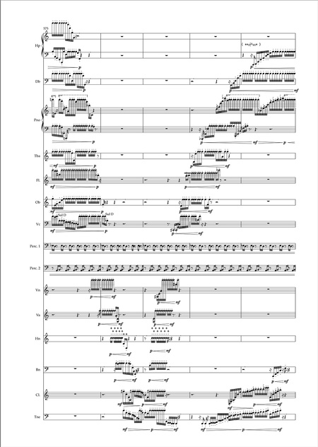 Музыканты в Актовом зале ГЭС-2 располагаются необычным образом. Это «перевернутый» концерт: дирижер стоит за зрителями и невидимо для них управляет музыкантами. Исполнители сидят не только на сцене, они, по сути, «опоясывают» звуком весь зал. Так создается геометрия невесомых и быстрых перемещений звука, которая графически записана в партитуре (нотный текст складывается в узоры, расположение которых обозначает передвижение звука в пространстве). Пьеса «После» — моя реакция на опустошение и кризис — идентичности и самоидентичности.