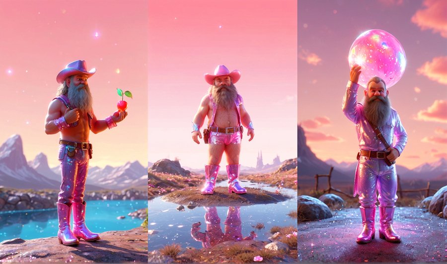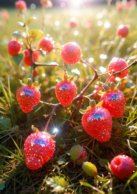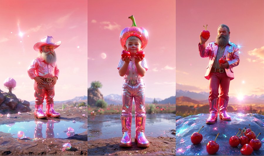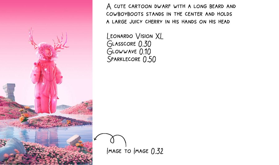 Leonardo Vision XL, Glasscore 0.30, Glowwave 0.10, Sparklecore 0.50 | Draw shiny cherries and lots of glossy glass gnome holding cherries. bright colors, yellow background
