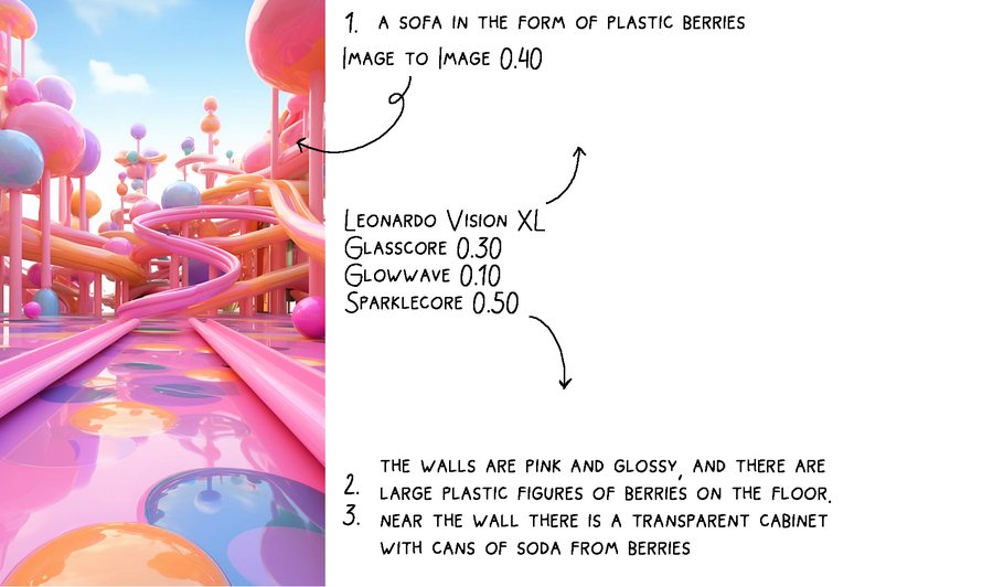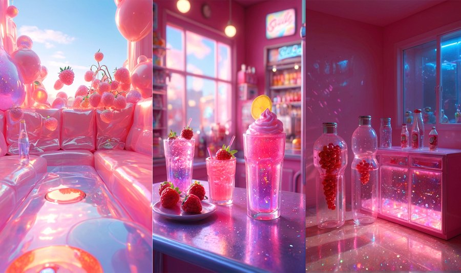 Leonardo Vision XL, Glasscore 0.30, Glowwave 0.10, Sparklecore 0.50, 3D Sculpt 1.00| make a 3D model of a store with soda berries