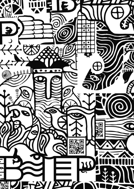 Композиция плакатов выстраивается по принципу «ковра»: поверхность листа плотно и равномерно заполняется всеми стилеобразующими элементами, выстраивающими внутренний мир и сюжет отдельной композиции. Сочетание чёрно-белых линий и контуров, ритмичных орнаментальных деталей и инверсивных фрагментов создаёт внутри плаката «шелест», визуальную вибрацию и движение — как будто ветер всколыхнул все детали внутри листа, и они зазвучали под воздействием потоков воздуха.