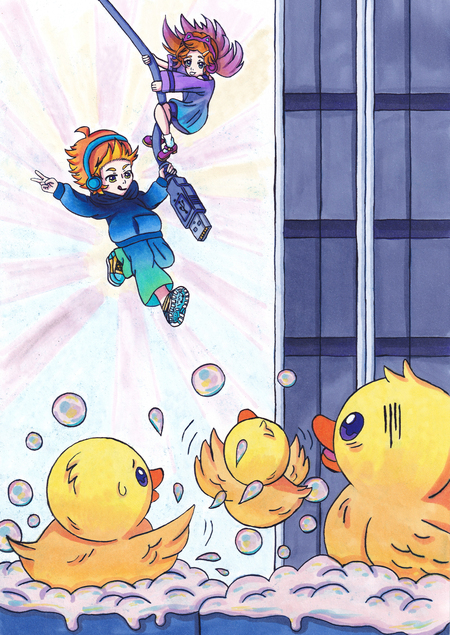 Героями истории являются мальчик и девочка, которые являются отражением маленького любопытного читателя. Они нарушают правила, мешая уточкам работать в мире компьютера. Уточки в данном случае являются отсылкой к методу резинового утенка.