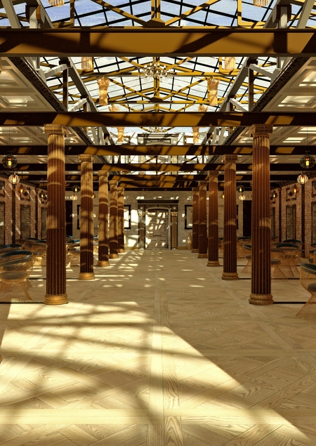 В основе концепции лежит история развития здания: от корпуса императорской суконной фабрики до руины. Пространство наполнено фрагментами эпохи ампира, выполненными из золотой проволоки. Ордер и декоративные элементы перекликаются с массивными металлическими конструкциями, хранящими память о военном прошлом цеха.