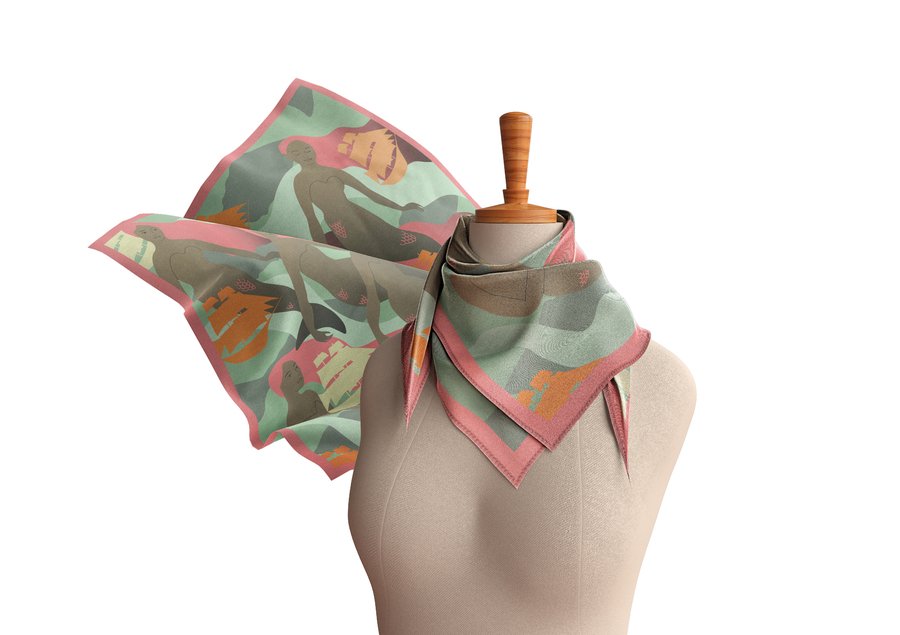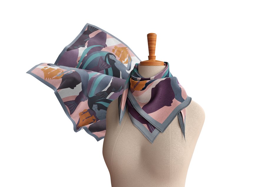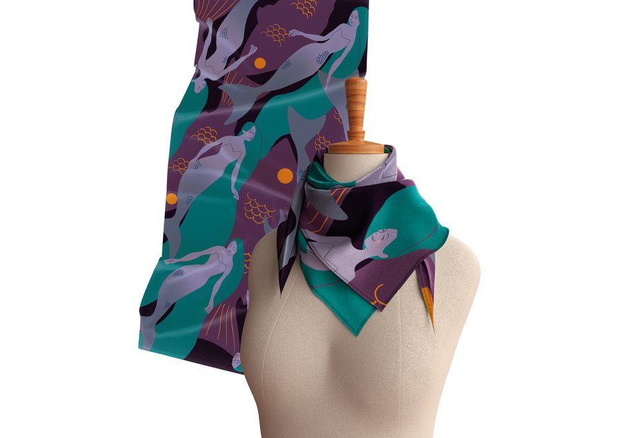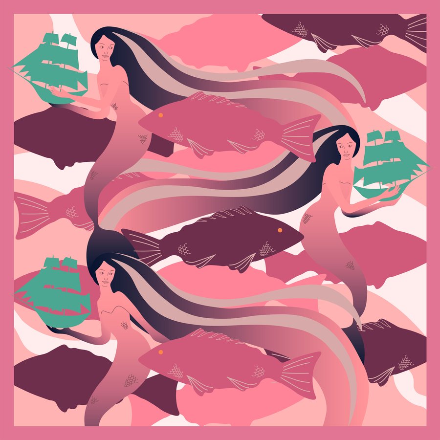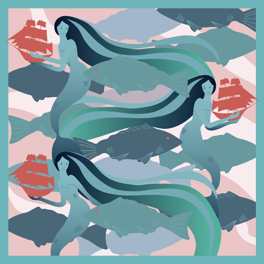 Серия платков о жизни русалок: то они игриво раскачиваются на волнах, то сливаются с косяком рыб и уходят глубоко под воду, то играют скораблями.