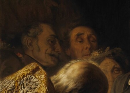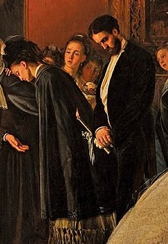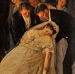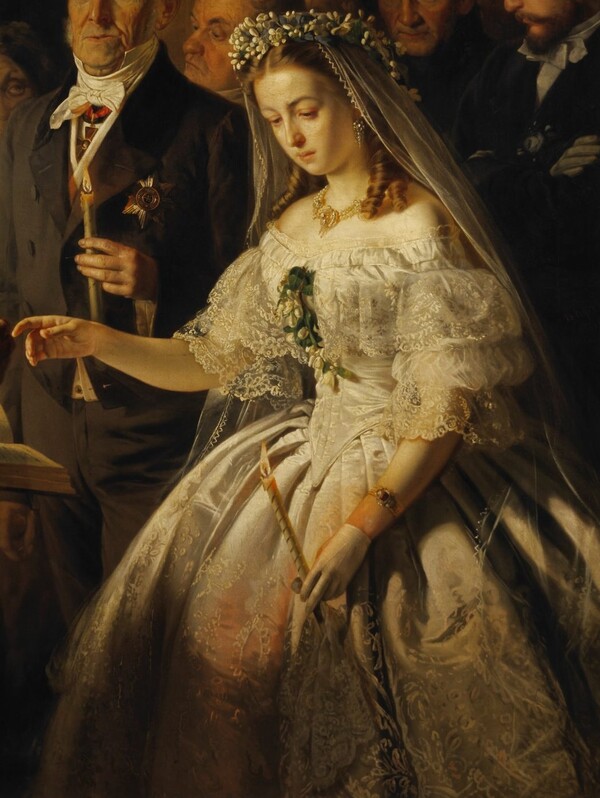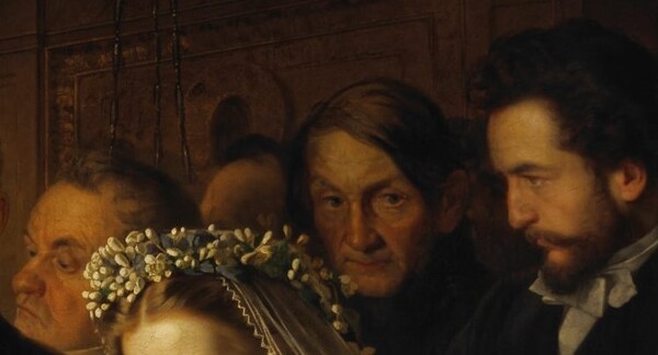 Лица мужчин справа от невесты выглядят печально, скорее всего они глубоко сочувствуют девушке. Один из них загадочно смотрит в сторону зрителей, словно осуждая возможность такого брака.