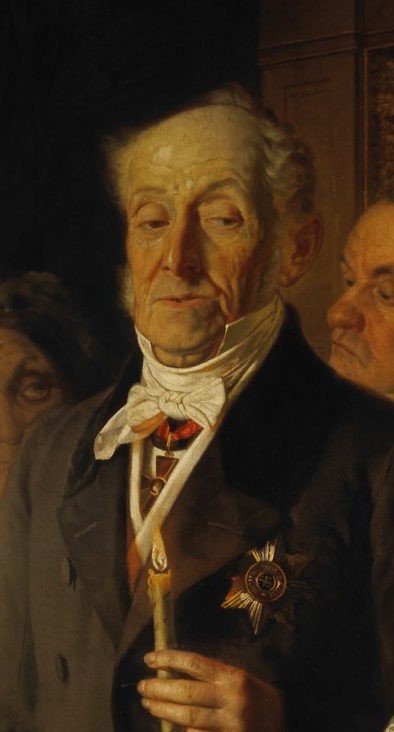 За спиной у жениха с невестой находится группа гостей. Двое мужчин слева от жениха наблюдают за венчанием с нескрываемым интересом. Один из них смотрит исподлобья на несчастную девушку. Другой же старается скрыть свой интерес и смотрит лишь краем глаза.