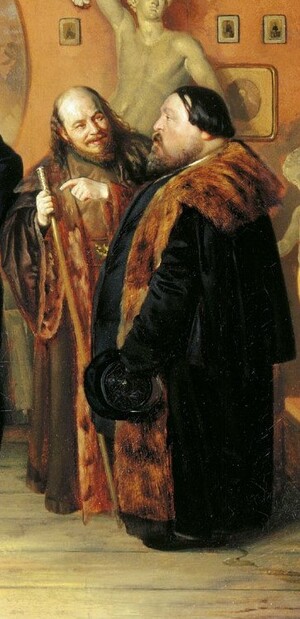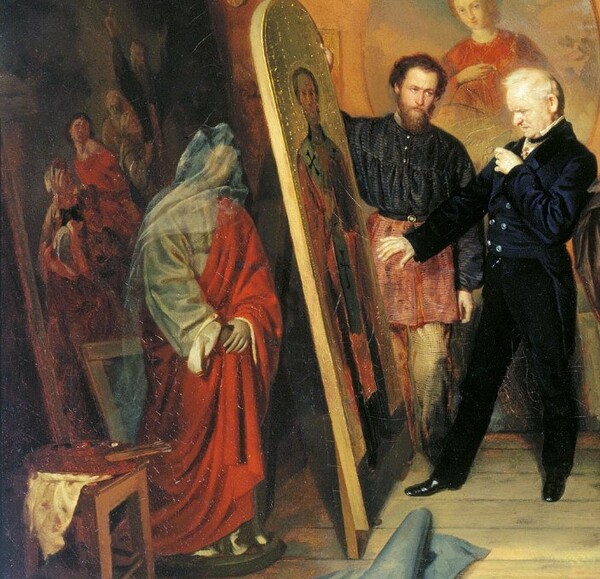 Уважаемый человек в костюме посетил мастерскую, чтобы купить картину, скорее всего, для своей личной коллекции. Позади него стоят священник и, возможно, другой творец, который внимательно смотрит в сторону холста.