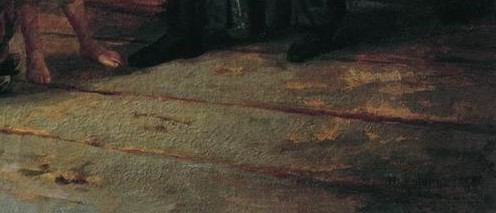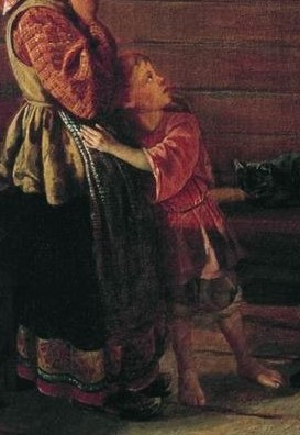Однако если присмотреться к лицам крестьян, можно заметить, что напуган только самый младший из них — маленький сын молодой девушки.