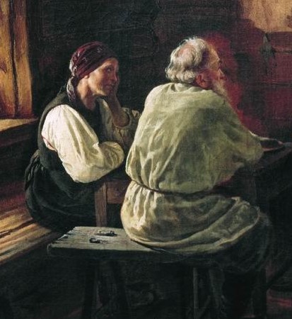 Обстановка в избе говорит о трудной жизни крестьян. Они не знают богатства, живут полуразрушенной избе и заклеивают щели бумажными полотнами.