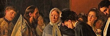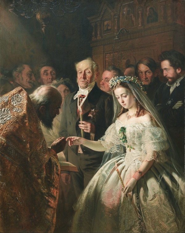 На картине проходит обряд венчания между юной девушкой и мужчиной в возрасте.