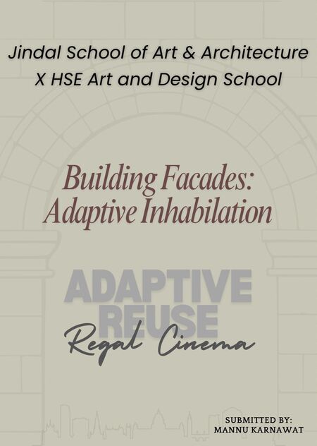 FROM SCREEN TO SKIN Adaptive Reuse of the Regal Cinema Facade, Connaught Place, New Delhi Design Question How can an Art Deco cinema facade, once a symbol of collective cultural experience which evolve into a responsive architectural interface that reflects contemporary cultural, technological, and environmental realities without erasing its historic identity? Context & Heritage Reading Regal Cinema, constructed in the early 1930s, represents one of New Delhi’s earliest Art Deco structures. Its facade, defined by strong verticality, symmetry, and ornamental restraint, once acted as a static public screen announcing films and cultural events. With the decline of single-use cinemas and changing urban patterns, the building today faces functional obsolescence despite its cultural significance. The facade thus becomes the primary site of intervention, balancing conservation with transformation. Design Strategy: From Screen to Skin The proposal reimagines the original cinema facade as a layered architectural skin. The historic plaster and masonry facade is retained as a visual and narrative backdrop, while a secondary layer of vertical fins derived from the original Art Deco geometry is introduced. This new layer functions simultaneously as climate control, media interface, and cultural communicator, transforming the facade from a static surface into an active urban element. Sustainability & Technology Integration Perforated terracotta and GFRC fins provide solar shading and reduce heat gain, while a ventilated cavity improves thermal performance. Photovoltaic panels are subtly integrated within horizontal bands to power low-energy LED lighting embedded in the fins. The lighting responds to environmental conditions and cultural programming rather than commercial advertising. Community & Urban Engagement The adaptive facade restores the building’s role as a public cultural mediator displaying art, film narratives, and community events bridging heritage and contemporary urban life. Through this transformation, the facade becomes a living interface connecting Delhi’s past, present, and future.