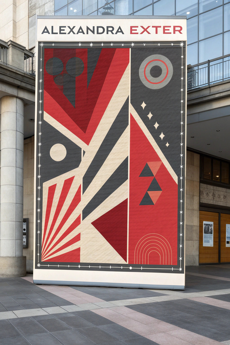 Выставка, посвящённая авангардистке Александре Экстер, оформлена в театральном стиле и отражает её вклад в искусство и сценографию. Особое внимание привлекают футуристичные колонны с атласной тканью, которые символизируют её связь с театром и талант в создании сценических образов.