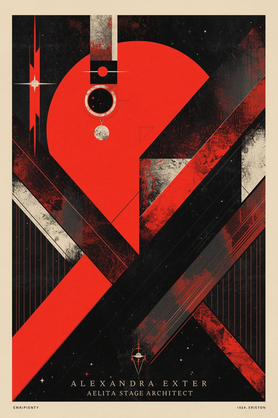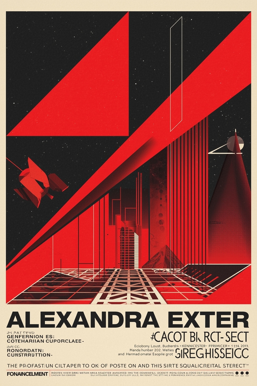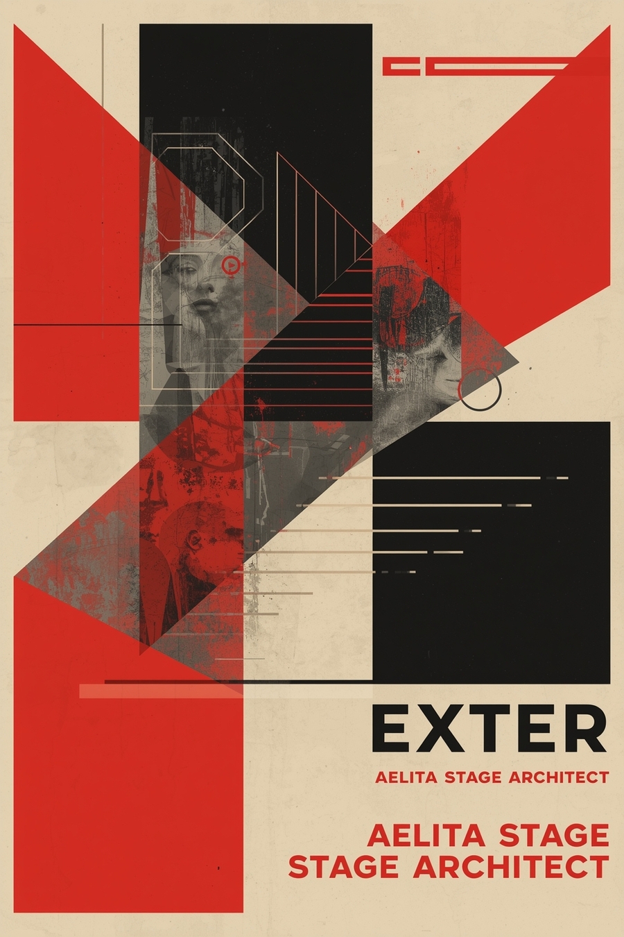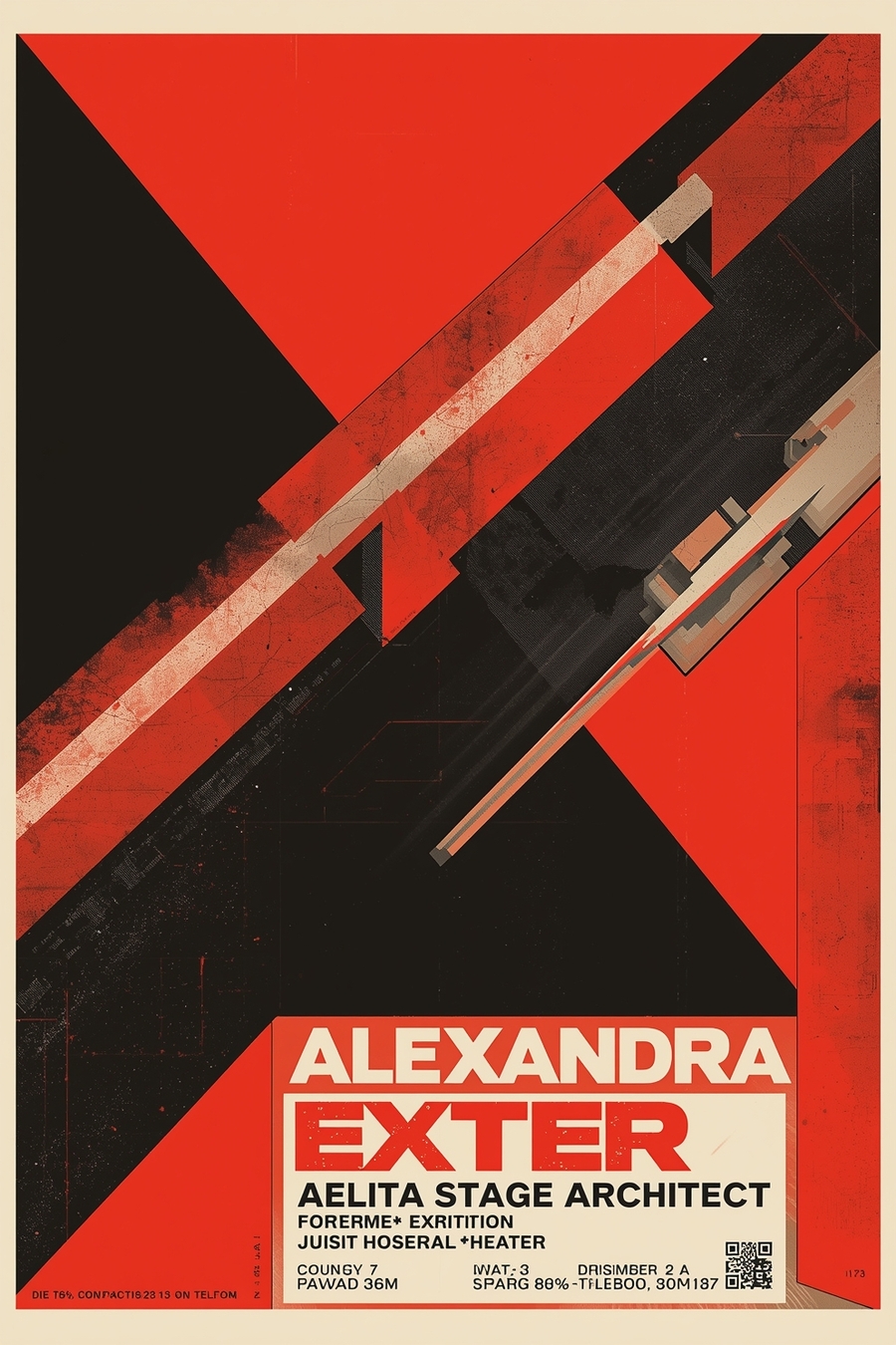 LeonardoAI: Avant-garde exhibition posters inspired by Alexandra Exter — bold geometric compositions with red, gray, and black shapes, dynamic diagonals, and rays of light. Clean white background, theatrical energy, museum lighting.