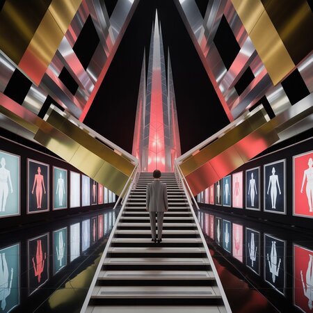 LeonardoAI/RecraftAI: Interior of an avant-garde art exhibition dedicated to Alexandra Exter — a minimalist geometric space inspired by her theatrical and Constructivist aesthetics. The hall features clean white walls, black metal structures, and dynamic red and gray accents. Abstract architectural panels and suspended diagonal frames evoke stage set design and the feeling of light in motion.