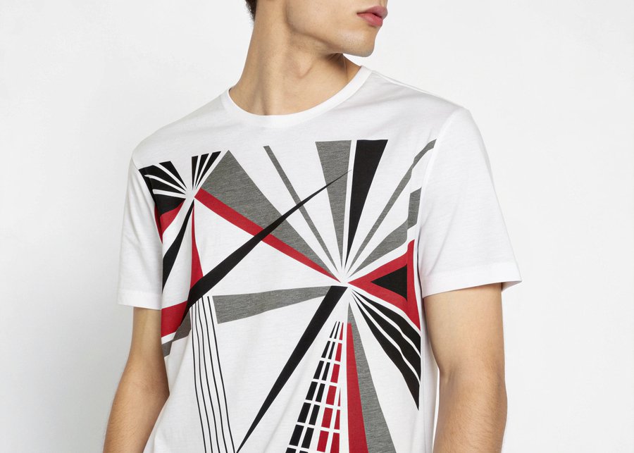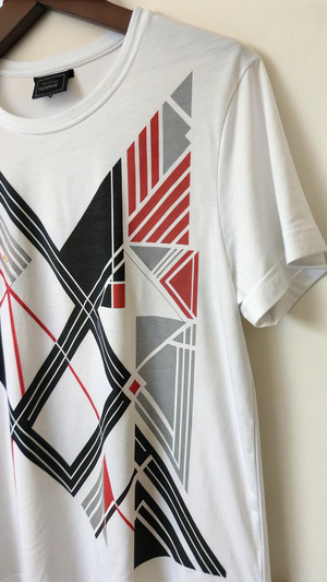Футболка RecraftAI: Vector T-shirt mockup — abstract Constructivist composition with intersecting red, black, and gray diagonals, minimalist layout, bold artistic balance.