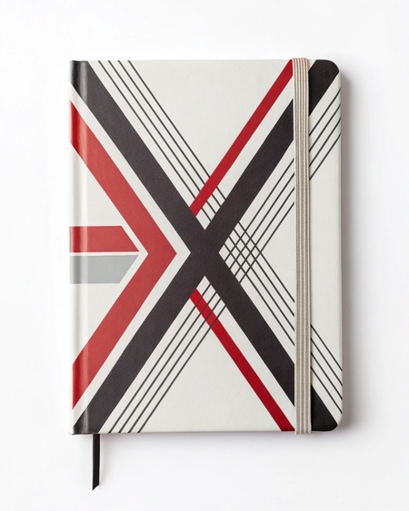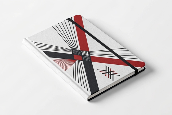Блокнот LeonardoAI: Notebook cover inspired by Alexandra Exter — matte white base with sharp red and black geometric planes, light-shadow interplay, modern Constructivist minimalism.
