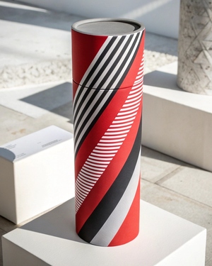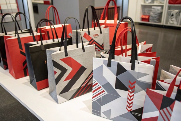Упаковки подарков RecraftAI: Vector gift packaging — abstract red and black diagonals on white, minimalist Constructivist geometry wrapping around bags and boxes, elegant modern composition.