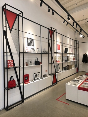 Сувенирный магазин RecraftAI: Flat vector interior of a modern art shop — angular geometry, red-black-gray palette, asymmetric shelving inspired by Constructivism, clean architectural layout.