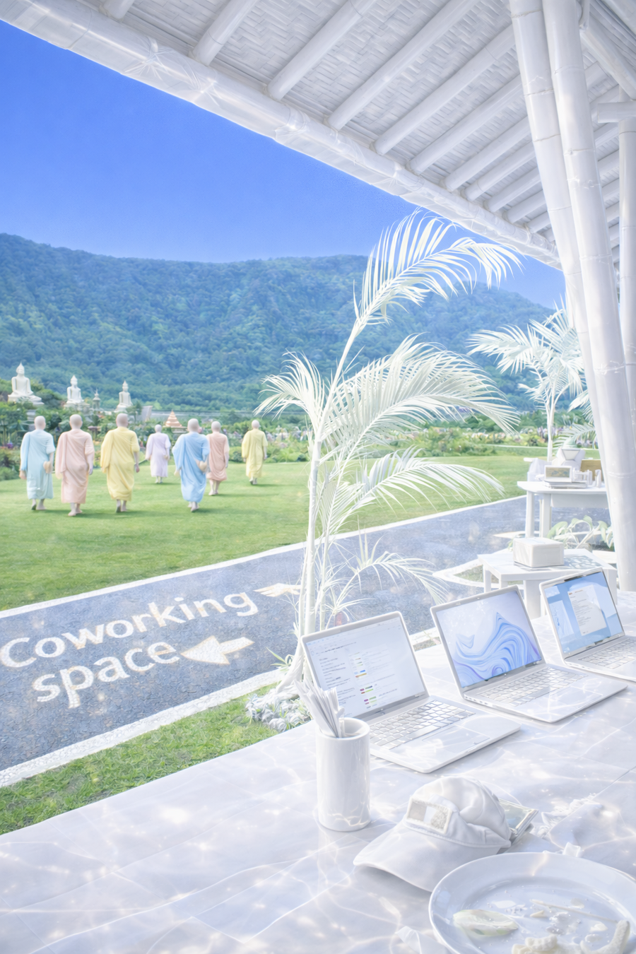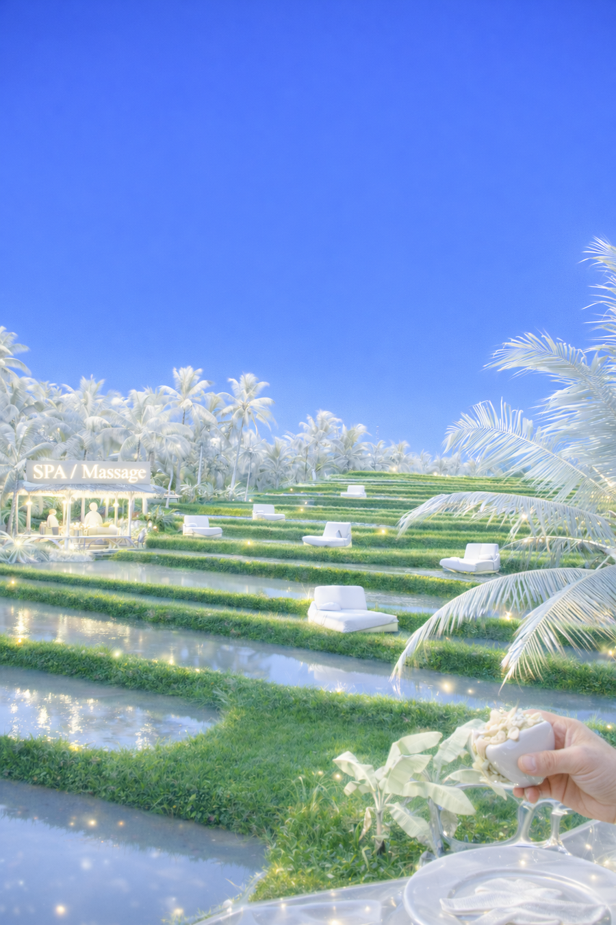 Позже, оказавшись в местах, которые ассоциируются с раем и популярны среди туристов, я снова столкнулась с этим ощущением подмены — увидела скульптуру Санта-Клауса рядом с буддистским храмом, коворкинги, встроенные в природу островов. Меня поразило, насколько легко любые смыслы встраиваются в райский пейзаж и как гладко он их принимает.