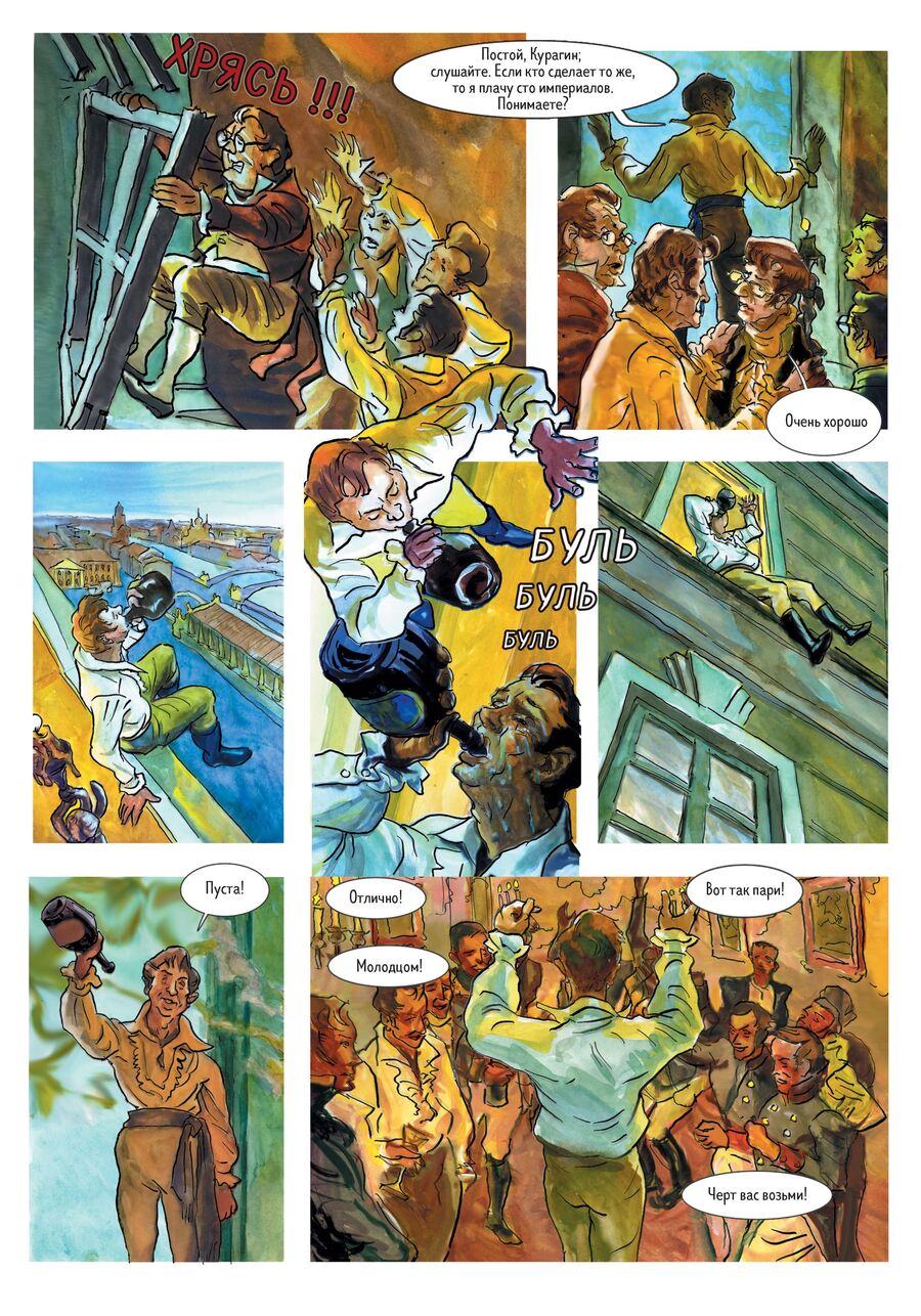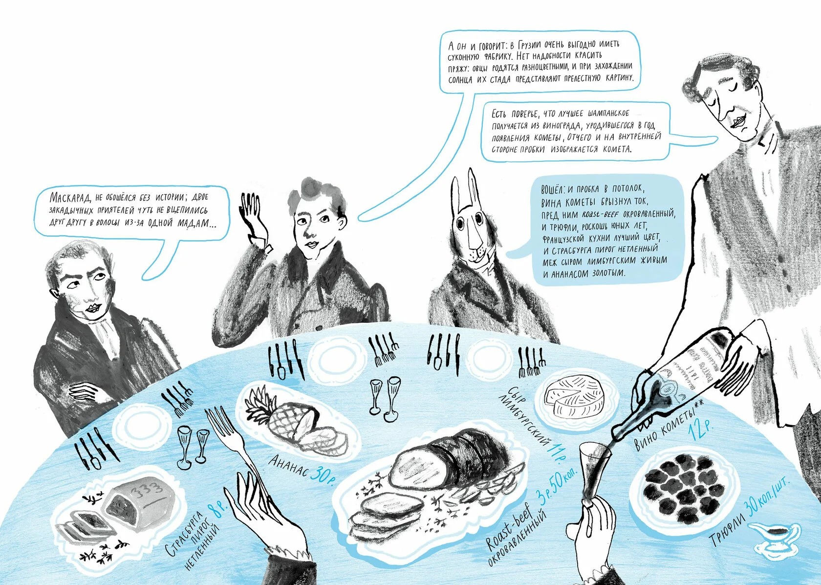 В аннотации пишется: «Для тех, кому школьная программа по литературе всегда казалась скучной, а стихи Пушкина не трогали душу и сердце. Именно для вас в первую очередь журналист и учитель литературы Алексей Олейников создал этот графический путеводитель» [4]. Мне кажется, что такой вид адаптации классики действительно является прекрасным дополнением к великому произведению, особенно это поможет школьникам для восприятия школьной программы. Герои путеводителя будто оживают для того, чтобы рассказать читателям всё о быте и нравах прошлого, дополняя рассказ остроумными, запоминающимися иллюстрациями.