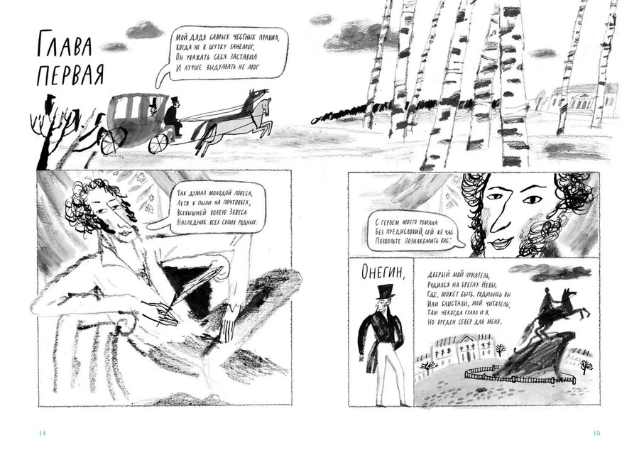 Диалоги и внутренние монологи персонажей переданы с помощью ярких кадров, что добавляет динамику повествованию. Это особенно важно для передачи внутреннего мира Евгения Онегина, его размышлений и переживаний. Автор умело сочетает текстовые элементы с визуальными, создавая гармоничное целое. Тексты, написанные Пушкиным, интегрированы в иллюстрации, что усиливает эмоциональное воздействие на читателя. Такой подход позволяет глубже погрузиться в мир романа и лучше понять его смысл.