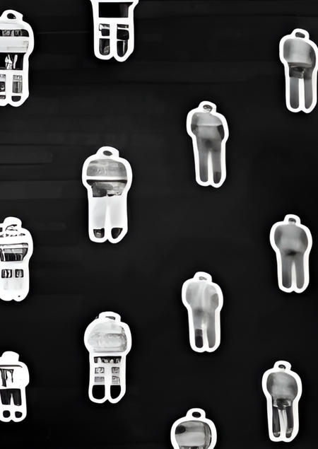 Промпт: A black background features an array of small, abstract figures resembling stylized human shapes. The figures are outlined in white, with some showing variations in opacity, creating a playful yet minimalist appearance. They are scattered evenly across the image, each with a unique stance or pose, contributing to a lively and dynamic composition.