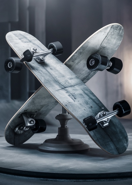 prompt: 3D render of a concrete printed skateboard, captured in a studio setting. The skateboard features the phrase «Outer Chaos, Inner Harmony» written in the Marlowe Swirl font. The wheels contrast with the skateboard’s color, sporting a sleek black finish. The background is dark and moody, with soft, ambient lighting, cinematic, 3d render