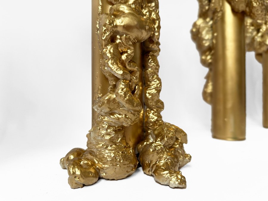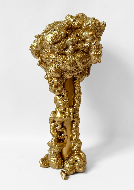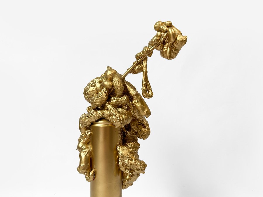 Мои скульптуры, покрытые золотой краской, представляют собой переосмысление медных тотемов-пустышек, у которых отсутствуют магические свойства, влияние на реальность, но способные морально поддержать человека.