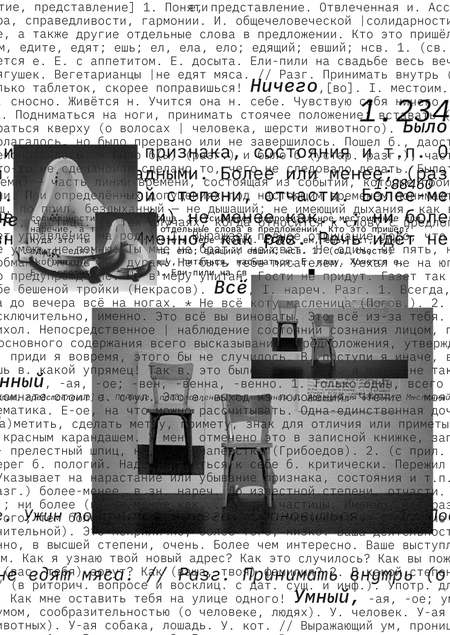 Скорость появления текста, мерцание графических элементов и фотографий не позволяют не только осознать текст, но даже прочитать его. Это и не нужно, глаз улавливает вырванные слова из основного текста, из бегущей строки или из фотографий (на некоторых из них тоже есть текст), а мозг уже в своем темпе конструирует собственные смысли, учитывая музыку и визуальные образы.